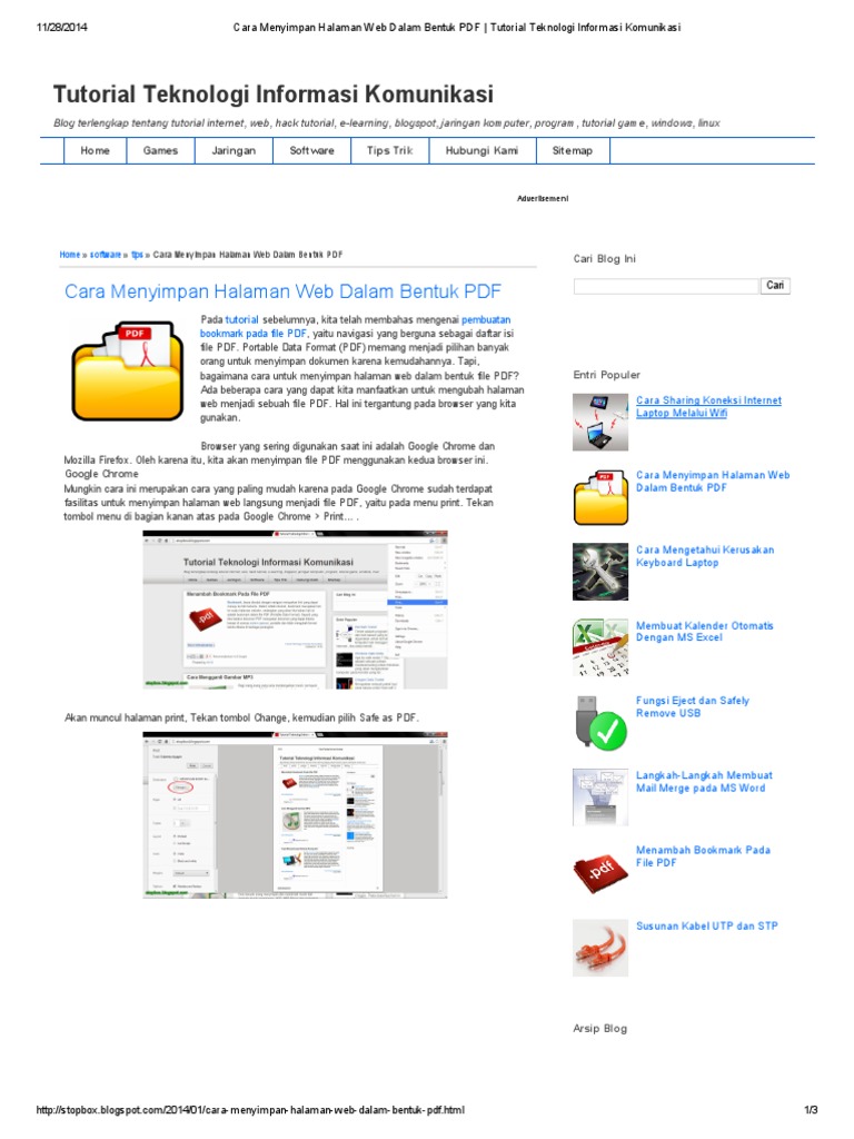 Kami tahu memilih save page as … akan menjadi pilihan yang logis, tetapi opsi itu adalah untuk menyimpan halaman dalam format web, bukan sebagai file berisi seperti pdf. Jadi keduanya tidak boleh di hilangkan sebab folder tersebut merupakan bagian dari file. Jelaskan tata cara penulisan alamat website! Anda bisa dengan cepat membuka jendela ini dengan menekan ctrl / ⌘ cmd + s, atau melakukan hal di bawah ini: Untuk menyimpan halaman web dalam fomat pdf dengan menggunakan google chrome, maka langkah pertama yang harus kamu lakukan adalah masuk ke menu google chrome dengan cara mengklik simbol 3 titik yang terdapat di sebelah kanan atas browser. Setelah itu ada sejumlah pilihan yang bisa kamu pilih. Tentukan lokasi penyimpanan dalam save in. Pilih lokasi untuk menyimpan halaman tersebut. Jika anda tidak memiliki rencana untuk mengonversi berkas kembali menjadi word, pilihlah web page, filtered. Perangkat keras langkah awal yang harus dilakukan adalah menyiapkan sebuah komputer yang akan dijadikan server atau dikenal dengan istilah web server. Dan jika anda membuat website untuk tujuan bisnis, untuk branding atau hanya agar website anda terlihat professional, maka anda membutuhkan nama domain yang berekstensi professional juga, seperti.com,.net,.id,.org,.co.id, dsb. Zamzar adalah pengonversi berkas sederhana yang hanya membutuhkan beberapa langkah untuk. Fungsi bookmark _ dengan menggunakan bookmark, maka kita akan dimudahkan dalam mencari halaman atau alamat situs yang kita inginkan sebab, kita tidak direpotkan lagi untuk mengetik alamat suatu situs.